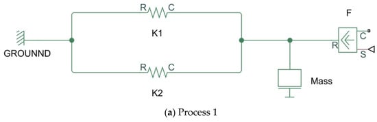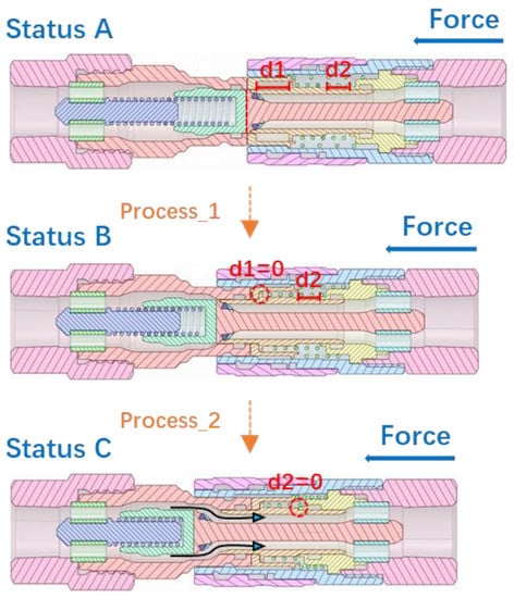Figure 1 shows the mechanism design of the CFFCS in the separated state. The plug connector on the left side and the socket connector on the right side of Figure 1 both have one-way self-sealing valves (1 and 4) that ensure the blockage of hydraulic fluid in the disconnected state. During the connection process, the pressure of the sealed high-pressure hydraulic fluid acts on the one-way self-sealing valve to generate a high amount of force (coupling resistance) that must be overcome to complete the connection process. Figure 2 shows the kinematics of the connection process of the plug and socket connectors of the CFFCS. Status A is the state where the plug and the socket have just made contact. During the course of pushing the socket to the left while the plug is fixed, Process 1 and Process 2 take place. Upon completion of these processes, the fluid path is fully opened. In order to facilitate their understanding, the theoretical models of the two processes are established, as shown in Figure 3, where only the influence of the mechanical spring element on the thrust is considered.