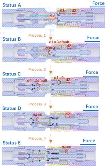 d1 represents the distance between the glove (3) and valve (4) in the socket. When d1 reduces to zero, the entire system reaches status B. As shown in Figure 3b, during Process 2, the valve (4) in the socket moves to the right along the guide (6). During this process, the springs K1, K2, and K3 work simultaneously. When valve (4) starts to move, the hydraulic fluid starts to flow through the entire coupling system. Finally, the fluid path is fully opened when the valve (4) makes contact with the guide (6) (i.e., d2 = 0).