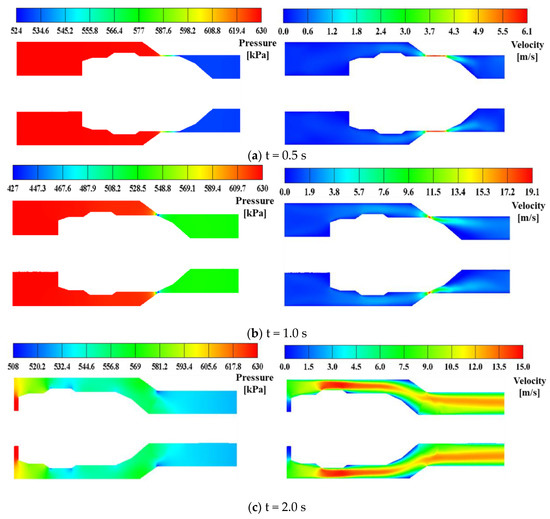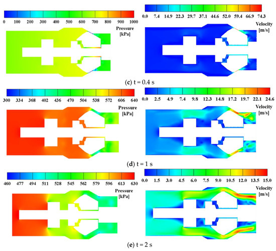 After the pin valve is fully opened (t = 0.4 s), the pressure at the inlet and outlet becomes almost equal (as shown in the left side image of Figure 9c). It can be seen that the opening of the pin valve connects the two chambers to achieve the effect of instantaneous pressure relief. At this time, the big valve in the plug starts to open. As the size of the valve opening increases, the extreme low pressure in the valve gap caused by the simulation limitations disappears, and the maximum flow velocity reduces accordingly, as shown in Figure 9d.