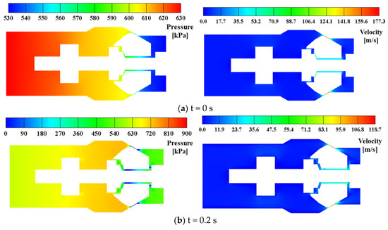As the gap of the pin valve becomes larger (t = 0.2 s), the fluid in the high-pressure side begins to flow into the outlet chamber through the pin valve gap and the pressure difference between the inlet and the outlet is reduced. Since the gap is small, the flow velocity in the gap is large (as shown in the right side image of Figure 9b), which results in very low pressure in the gap (as shown in the left side image of Figure 9b). Due to high-speed flow at the end of the gap, the fluid accumulates at the corners and is squeezed by the following high-speed fluid, which forms a local high pressure region.