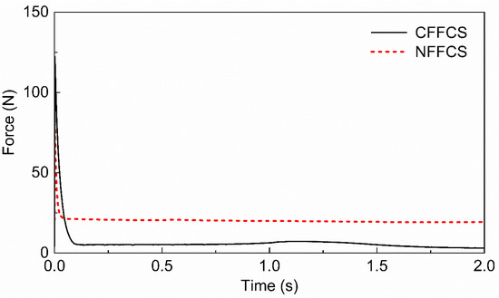 In order to observe the impact of hydraulic power on the coupling system, the axial resistance caused by the hydraulic oil to the valve opening during the coupling processes of CFFCS and NFFCS were monitored separately. The results of this study are summarized in Figure 10. The solid line represents the opening force results for the CFFCS and the dashed line represents the opening force results for the NFFCS. It can be observed that the maximum resistance for the CFFCS is about 122.3N, which occurs when the valve starts to be pushed (t = 0 s). This force then quickly drops to an approximately stable value (about 5N). When the valve is opened (t = 1.0 s), the thrust has a small increase and then stabilizes again. On the other hand, the NFFCS releases the pressure by opening the pin valve before the big valve is opened to achieve full conduction. When the pin valve is opened, the maximum axial thrust of 80.7N appears at the start of the push (t = 0 s), which then gradually decreases and stabilizes. It can be seen that the maximum axial resistance occurs at the same time (the beginning of the movement) in both the mechanisms. However, the presented NFFCS showed a resistance value that is 34% less than that showed by the CFFCS. Although the grid size at the gap has been divided to be an extremely small value, it still is difficult to obtain the data that is completely consistent with the actual due to the limitations of the dynamic mesh algorithm. However, the overall trends shown in the simulation can be considered as a reasonable depiction of the actual situation. Thus, we can safely infer that the design of the NFFCS can relieve the high pressure instantly with a small opening force so that the big valve can be easily opened to connect the hydraulic circuit.