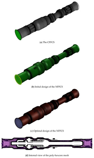 Figure 11a–c respectively show the mesh on the major internal components and the inlet boundary conditions for the CFFCS model, the initial NFFCS model and the optimized NFFCS model. In this simulation, Ansys Mosaic Meshing Technology was used to generate the mesh in the unique poly-hexcore form shown in Figure 11d. The poly-hexcore mesh provides higher accuracy and faster calculation speed for complex CFD problems [40].