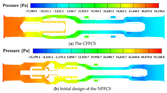 Pressure distribution results for the two flat–face coupling systems, (a) The CFFCS and (b) Initial design of the NFFCS.