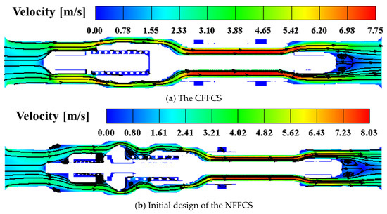 Velocity and streamline distributions for the two flat-face coupling systems, (a) The CFFCS and (b) Initial design of the NFFCS.