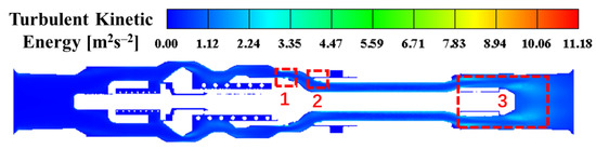 Figure 14 shows the turbulent kinetic energy distribution of the initial NFFCS design. It can be seen that the turbulent kinetic energy has a large value at positions 1 and 2 marked by the red dashed box, while a large area of energy loss occurs at position 3.