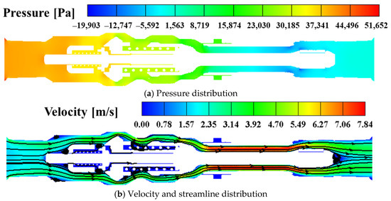 The left and right chambers start to connect during the leftward movement of the valve (as shown in Figure 8b). At this time, the gap between the valve and glove reaches its smallest value. In this state, the fluid is pushed by the high pressure in the left chamber to pass through the gap at a great velocity and form an obvious velocity gradient in the low-pressure area. At this time, the pressure distribution of the two chambers still does not change greatly.