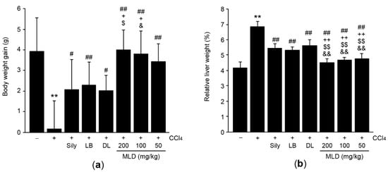 To investigate the hepatoprotective effects of MLD, CCl4 (0.5 mL/kg in olive oil; i.p.) was treated once into mice that had been administered with silymarin (200 mg/kg), LB (100 mg/kg), DL (100 mg/kg), or MLD (200, 100, or 50 mg/kg) for 7 days. On day 0, body weight of vehicle-treated group was 30.15 ± 0.84 g, and there were no differences among experimental groups. Body weight on day 7 after treatment with CCl4, CCl4 + silymarin, CCl4 + LB, CCl4 + DL, CCl4 + MLD 200, CCl4 + MLD 100, and CCl4 + MLD 50 was 88.65 ± 4.49, 95.66 ± 4.80, 95.83 ± 6.02, 93.91 ± 4.75, 101.39 ± 5.17, 100.44 ± 3.26, and 101.15 ± 5.75% of vehicle-treated group, respectively. Compared to the vehicle, CCl4 injection significantly decreased body weight gain (p < 0.01; Figure 1a), and this was parallel with previous observation that CCl4 causes anorexia [,]. However, MLD (50–200 mg/kg) significantly inhibited the CCl4-mediated reduction in body weight gain (p < 0.01). In addition, three doses of MLD tended to further increase the body weight gain compared to silymarin, LB, or DL. But body weight gains due to silymarin versus 100–200 mg/kg MLD, LB versus 200 mg/kg MLD, and DL versus 100 mg/kg MLD were only statistically significant (p < 0.05; Figure 1a). Furthermore, CCl4-mediated increases in relative liver weight were significantly attenuated by the three doses of MLD, silymarin, LB, and DL (p < 0.01; Figure 1b). The magnitude of the MLD-mediated reduction in relative liver weight was greater than that associated with silymarin or either of the herbal extracts alone (p < 0.01; Figure 1b).