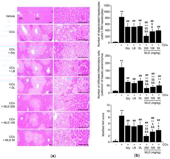 MLD protects the liver from CCl4-induced damage. (a) Representative hepatic tissues stained with hematoxylin and eosin. Scale bars, 200 μm. (b) The numbers of degenerated hepatocytes (upper) and infiltrated inflammatory cells (middle), and modified HAI scores (lower) were quantified using an image analyzer. All values are expressed as mean ± SD of ten mice. ** p < 0.01 between the vehicle and CCl4 groups; ## p < 0.01 versus CCl4-injected mice; ++ p < 0.01, + p < 0.05 between Sily- and MLD-treated mice; $$ p < 0.01, $ p < 0.05 between LB- and MLD-treated mice; && p < 0.01, & p < 0.05 between DL- and MLD-treated mice. CV, central vein; PT, portal triad.