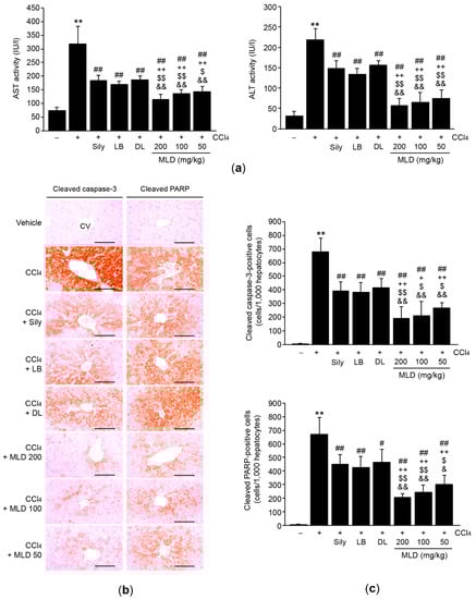 MLD attenuates apoptosis of hepatocytes. (a) Effects of MLD on serum AST and ALT activities. (b) Hepatic tissues were immunostained using cleaved caspase-3 or cleaved polymerase (PARP) antibodies. Scale bars, 200 μm. (c) Positive cells in the hepatic parenchyma around the central vein were counted. All values are expressed as mean ± SD of ten mice. ** p < 0.01 between the vehicle and CCl4 groups; ## p < 0.01, # p < 0.05 versus CCl4-injected mice; ++ p < 0.01, + p < 0.05 between Sily- and MLD-treated mice; $$ p < 0.01, $ p < 0.05 between LB- and MLD-treated mice; && p < 0.01, & p < 0.05 between DL- and MLD-treated mice. CV, central vein.