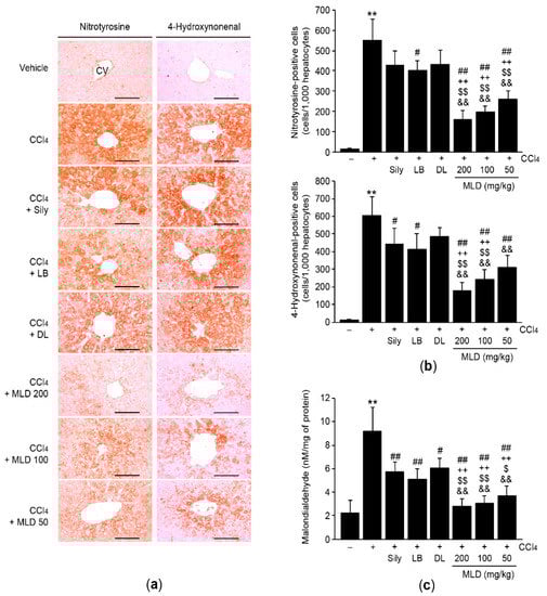 MLD alleviates CCl4-mediated oxidative stress. Hepatic tissues were immunostained using anti-nitrotyrosine or anti-4-hydroxynonenal antibodies (a), and positive cells were counted (b). Scale bars, 200 μm. (c) Lipid peroxidation. Malondialdehyde concentration was determined using liver homogenates. All values are expressed as mean ± SD of ten mice. ** p < 0.01 between the vehicle and CCl4 groups; ## p < 0.01, # p < 0.05 versus CCl4-injected mice; ++ p < 0.01 between Sily- and MLD-treated mice; $$ p < 0.01, $ p < 0.05 between LB- and MLD-treated mice; && p < 0.01 between DL- and MLD-treated mice. CV, central vein.