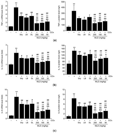 MLD inhibits the production of proinflammatory cytokines in CCl4-treated mice. Levels of mRNA (left) and proteins (right) of TNF-α (a), IL-1β (b), and IL-6 (c) in the liver were determined using real-time PCR and ELISA, respectively. All values are expressed as mean ± SD of ten mice. ** p < 0.01 between the vehicle and CCl4 groups; ## p < 0.01, # p < 0.05 versus CCl4-injected mice; ++ p < 0.01, + p < 0.05 between Sily- and MLD-treated mice; $$ p < 0.01 between LB- and MLD-treated mice; && p < 0.01, & p < 0.05 between DL- and MLD-treated mice.