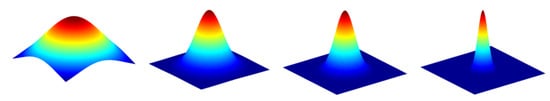 For the precise implementation of the framework, the shape parameter evaluation is important [34]. Therefore, careful attention should be given for determining shape parameter value. Detailed discussions regarding values for the shape parameter can be found in Fasshauer [35], Franke [36], and Hardy [37]. Most formulations for shape parameters depend on the distance, d, and node numbers, N. Other formulations display a changing shape parameter depending on the location of the node. In general, the shape parameter depends upon several variables such as the data point distribution, the basis function, and a computer precision (see [38]). The effect of the rbf Gaussian shaping parameter mentioned above is shown in Figure 3.