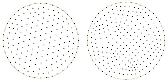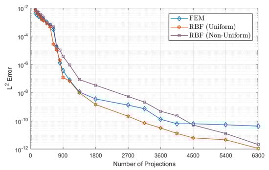 The complicated meshing rules are not required while performing rbf, and here lies the advantage of the proposed method over the framework of finite elements. The use of meshless methods over the finite-element approach for reconstruction tensor strain field [39,40,41] has many other benefits. We can quickly increase the support domain, change basis functions, adopt nodal densities, and many more. Those characteristics can be useful in the case of irregularities like sharp discontinuations or other situations in complex simulations. In the next section, we talk about this difference between methods with a simulated example.