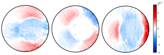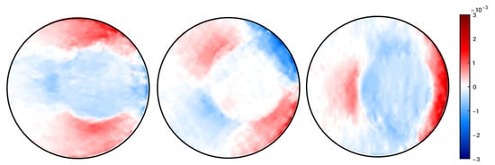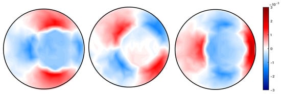 The Least square solution was found for 3790 nodes for the non-uniform and 3795 nodes for uniform ring-and-plug discretization from 22,678 projections. Figure 12 and Figure 13 shows the reconstructed field of ring-and-plug with uniform and non-uniform node distribution respectively in terms of three Cartesian strain components namely; and . The reconstructed strain field was found for 1352 nodes and 1086 quadrilateral elements via fem approach and 1352 nodes for crushed ring discretization via rbf approach from 20,664 projections. Figure 14 and Figure 15 shows the reconstructed strain field of crushed ring with fem and rbf respectively in terms of three Cartesian strain components. Figure 16 and Figure 17 show the corresponding validated strain field from kowari data. The effectiveness of the suggested approach is not based solely on sample structures and can, thus, be extended to three-dimensional sample bodies. Due to radial basis function computation, the real challenge is the computational cost and time since the size of the problem is quite large.