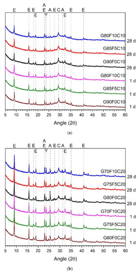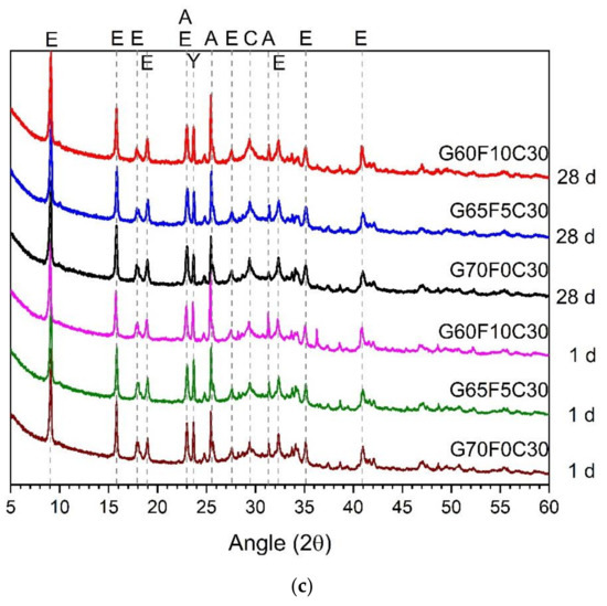 XRD results (a) 10% CSAe at 1 d and 28 d (b) 20% CSAe at 1 d and 28 d, (c) 30% CSAe at 1 d and 28 d, E: ettringite, A: anhydrite, Y: ye’elimite, C: C-S-H/calcite (overlap).