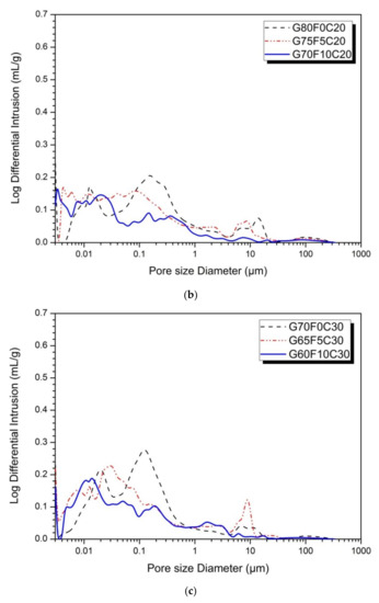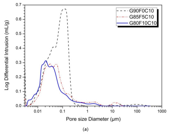 As the substitution ratio of CSAe increased, the number of pores decreased. This tendency was confirmed by the gradual decrease in the peak height of the graphs of G90F0C10 (Figure 4a), G80F0C20 (Figure 4b), and G60F0C30 (Figure 4c). In addition, in the samples with SF substitution, the graph is shifted to the left as a whole, and it can be seen that pores of smaller diameter are formed. In Figure 4, the samples with SF substitution showed a similar tendency; the peak of the graph decreased as the substitution ratio of CSAe increased. The increase in the amount of CSAe increased the production of C6A3H32, which changed the pore structure by filling the pore interior. Thus, as more C6A3H32 was produced, the number and size of the internal pores decreased.