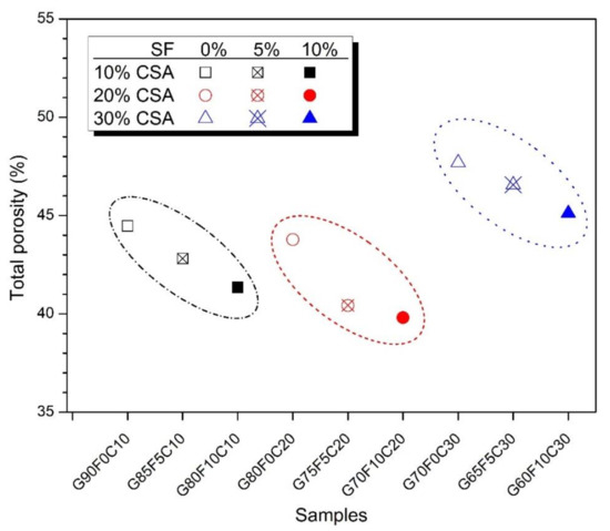The results of Chaunsali and Mondal [51] revealed that OPC and 30% CSAe cement increase porosity by excessive cracking. The total porosity results in Figure 5 showed similar trends in increasing the total porosity due to cracking at high CSAe substitution rates, as reported by Chaunsali and Mondal [51]. Therefore, in the range of the conditions considered in this study, 20% CSAe is the optimum mixing ratio for the improvement of compressive strength and the formation of a dense matrix.
