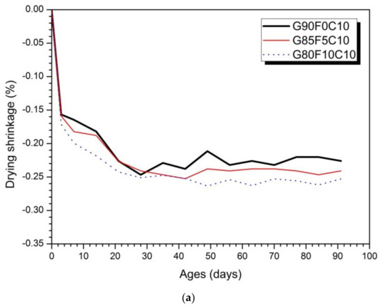 For the compressive strength tests, a mold sized 50 mm × 50 mm × 50 mm was used, and the measurement method was ASTM C109 [29]. The drying shrinkage was measured according to ASTM C596 [30] using a 40-mm × 40-mm × 160-mm mold, and the length change was measured once every 7 d up to 91 d of aging.