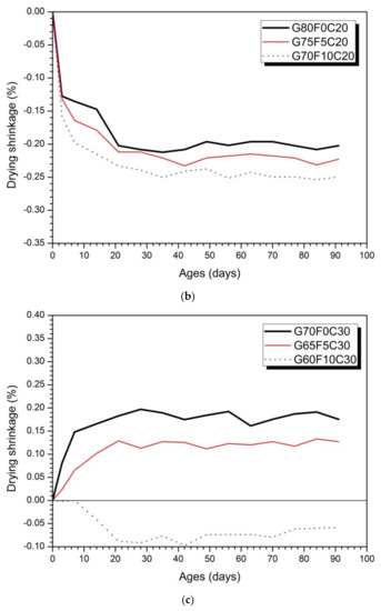 Drying shrinkage ratios, (a) 10% CSAe, (b) 20% CSAe, and (c) 30% CSAe.