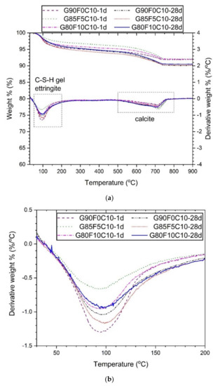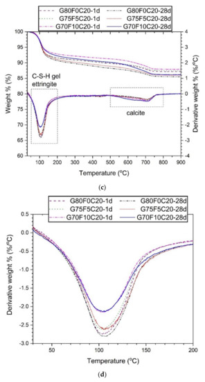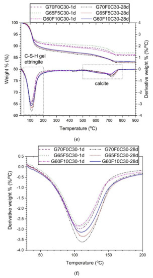 In Figure 8b, the weight loss ratio of 1d was changed in the order of G90F0C10 > G80F10C10 > G85F5C10 and at 28d in the order of G85F5C10 > G90F0C10 > G80F10C10. In addition, as shown in Figure 8d, the weight loss ratio gradually decreases in the order of G80F0C20 > G75F5C20 > G70F10C20 in 1d and G80F0C20 > G75F5C20 > G70F10C20 in 28d. In Figure 8f, the weight loss tends to change in the order of G70F0C30 > G65F5C30 > G60F10C30 when 1d and G70F0C30 > G65F5C30 > G60F10C30 when 28d. The weight loss observed in the region below 200 degrees Celsius is complex and unclear. This makes it difficult to distinguish clearly because hydration products are generated by SF and simple evaporation of moisture occurs at the same time [55,56]. Particularly, very fine particles of SF require a large amount of bound water [55,56,57,58]. Therefore, some of the water required for the hydration reaction of slag or CSAe particles is bound to the surface of the SF particles, which can be considered as an unclear cause of weight loss that hinders the hydration action.