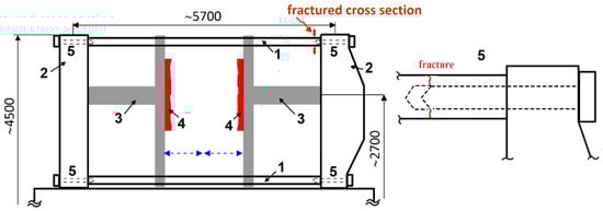 An industrial press is an immense structure forming part of a fully automated assembly line. The fatigue lifetime assessment of production line structures of such types is difficult because there are only a few examples operating in the world. Thus, this structure can be considered more like a prototype stage than mass-produced machines. The unexpected fatigue crack occurred on this type of device after several years of operation on the main frame support. The simplified scheme of the front part of the device for the production of car tanks is displayed in Figure 1.