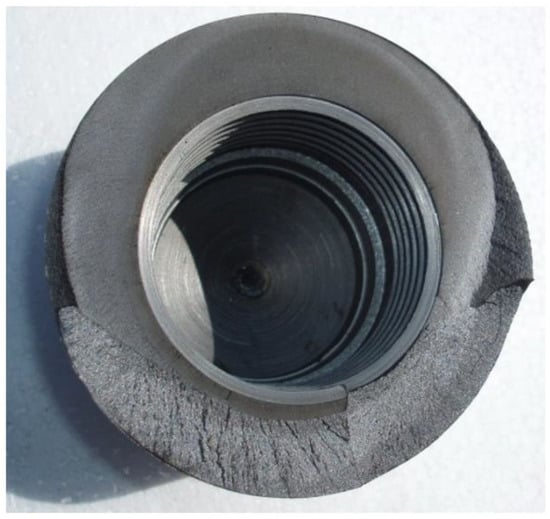 The fatigue crack initiation site was at the root of the internal thread (the first engaged thread, see Figure 1). The criticality of this cross-section was predetermined by the change in cross-sectional stiffness at the location between the end of the bolt and the bottom of the threaded hole (Figure 2). In this area, the annular cross-section caused additional bending loading under the tensile loading from the prestressed bolt and the pressing force developed by the hydraulic cylinder. The resulting value of the stress (from the bolt pre-tension, additional bending moment, and pressing force) had to be recalculated (transformed) into the notch root of the thread. The effective method for such transformation, applicable in engineering practice, is Neuber’s method [12,13]. The equation below requires the knowledge of nominal stress/strain value σn/εn, deformation as well as the effective notch coefficient of the thread root in the hole of the guide bar: