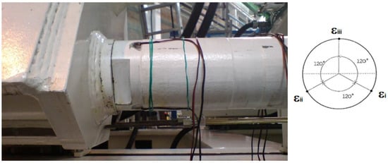Along the critical cross-section of the guide bar, strain gauge sensors were installed at 120° spacing, so that it was possible to differentiate the effect of bending moments and normal force [10,11] (Figure 5). This procedure allowed the point of maximum cross-sectional stress to be determined using equations for the calculation of the stress from normal force and the maximum stress from the bending moment: