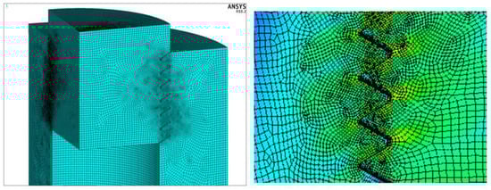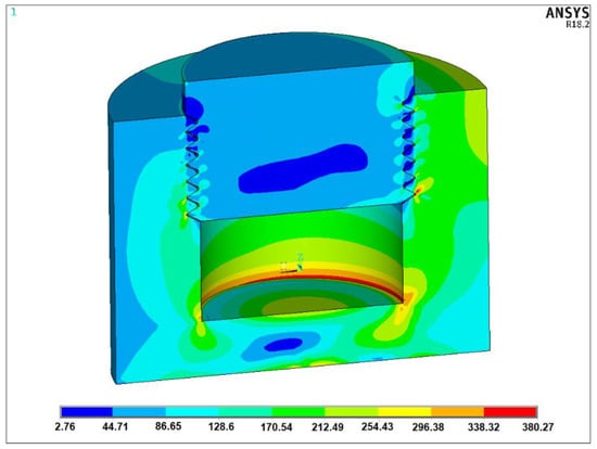 The value of the stress concentration factor Kσ can be determined in several ways, e.g., by using the approach of equivalent ellipse and applying the expression for an elliptical groove [6] or using the FEM model. Let us note that the usage of modeling with FEM frequently requires a careful choice of mesh, types of elements, and boundary conditions [14] (see Figure 7). When using a sufficiently fine mesh requiring as many as five elements at the thread root, a linear element (Solid 8 Node 185) could be used. At the interface of threads, an 8-node contact element (Conta 174) was employed in combination with a 3D Target 170. The setting-up of the conditions of contact and boundary conditions of the calculation was based on reaching the same stress values on the surface of the guide bar as were obtained by direct measurement. The results of the precision mathematical model of the critical node under the load of tensile force and bending moment corresponding to the measured values of stress according to Figure 6 are in Figure 8. For the value of the nominal stress from the tensile force of 40 MPa and the bending at the thread point of 30 MPa, the value of the stress concentration factor based on FEM simulation is Kσ = 5.43 and using Equation (3) for the notch factor is Kef = 4.4 ÷ 4.53.