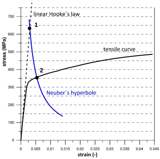 The value of the stress in the root of the internal thread is obtained by applying the Neuber method (Equation (2)). The nominal stress is based on the measured values of tensile stress (40 MPa) and additional bending stress at the thread point (30 MPa), to which the stress from the bolt pre-tension (74 MPa recalculated according to the manufacturer’s data) is added. Point 1 in Figure 10 represents the stress at the root of the thread for a linear material model, point 2 for the actual tensile curve of the guide bar material.