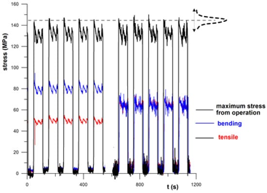 where Δ is the maximal range of the stress amplitude value determined by measurement directly in operation (Figure 6 and Figure 12) and u95% is the normal distribution quantile for a 95% probability of occurrence.