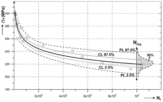 Scattering of cyclic material properties on the S–N material curve described using the intervals of reliability (confidence limit—CL, prediction limit—PL).