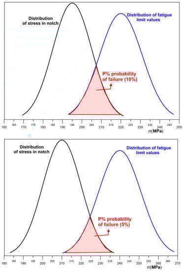 A distribution function of stress in notch (resulting from the uncertainty of designation of notch coefficient and fluctuation of the stress in the individual working cycles in Figure 12, uncertainty of notch factor Kef and mean value of stress cycle taken into account based on Goodman’s [17] or Morrow’s [18] approach) is given by the following parameters of normal distribution: .