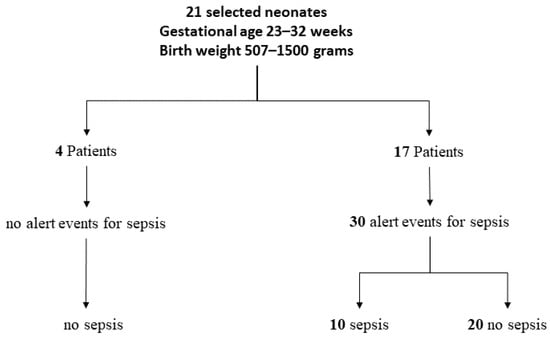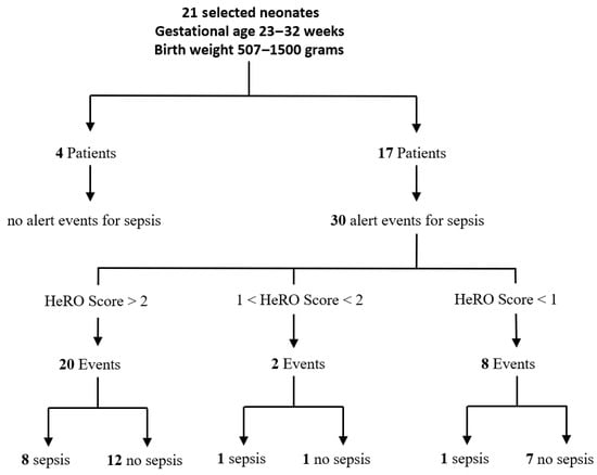 In particular, if the event was the positivity of the HeRO score, all analysed parameter values were referred to the next 24 h, whereas if the event was the presence of symptoms and/or the positivity of the inflammation indexes, all analysed parameters values were referred to the previous 24 h. In 17 patients out of 21, alerts were observed that raised the suspicion of sepsis for a total of 30 alerts (or clinical cases). In 10 clinical cases out of 30, sepsis diagnosis was then confirmed. The studied cohort also included four patients that neither presented any signs of sepsis, nor were affected by sepsis.