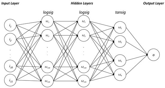 1)), measured on the test set, over 100 iterations of training, validation and testing of the ANN. To do this, each individual in the GA population, namely each candidate ANN topology, was trained, validated and tested 100 times considering random permutations of the input dataset, splitting it into 60–10–30% for training, validation and test sets, respectively. Each ANN could be constituted by at least one hidden layer, up to three, with at maximum 256 neurons per layer. The GA also evaluated several activation functions (each hidden layer shared the same transfer function for all the neurons of the layer), namely the hyperbolic tangent sigmoid transfer function (