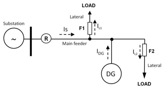 The protection of the distribution networks studied in this work was guaranteed by main protection relays located at the beginning of the line (that is, at the electric substation (S)), and cut-out fuses (F1, F2) at the laterals. The basic topology of this kind of network is shown in Figure 1, where a distributed generation (DG) source has been added. The main feeder is protected by a relay (R), whereas the laterals supplying the loads are protected by means of fuses.