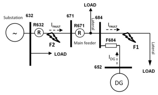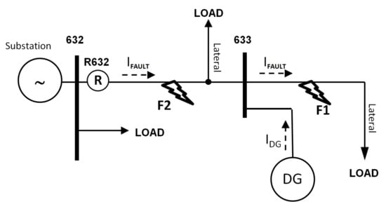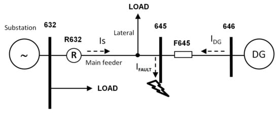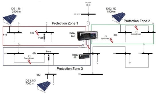 In Figure 3, the electric circuit corresponding to Protection Zone 1 with a 1 MW photovoltaic DG source (connected to bus 646) is shown (see also Figure 2). Protection elements in this area include an overcurrent relay at the beginning of the line (bus 632), and a fuse (F645) to protect the line connecting the DG. Only a 1 MW power supply through bus 646 was analyzed, as it represented the maximum power that was able to be injected by the DG in continuous operation (larger installed powers always tripped fuse F645).
