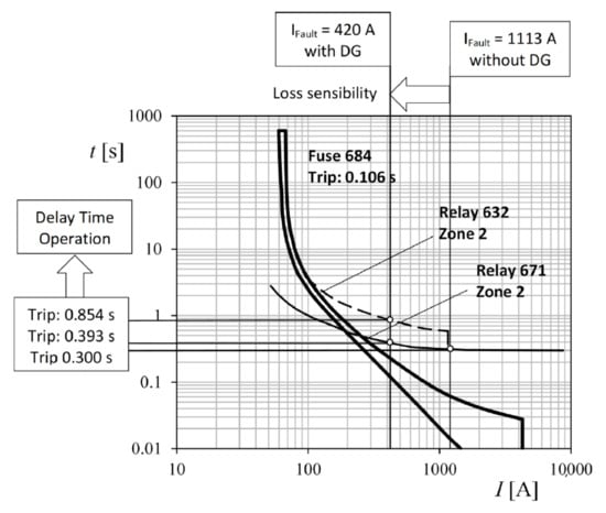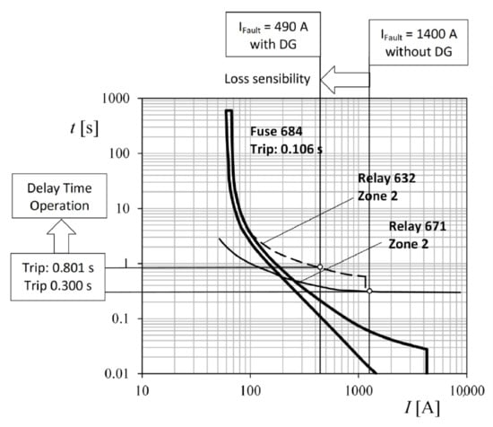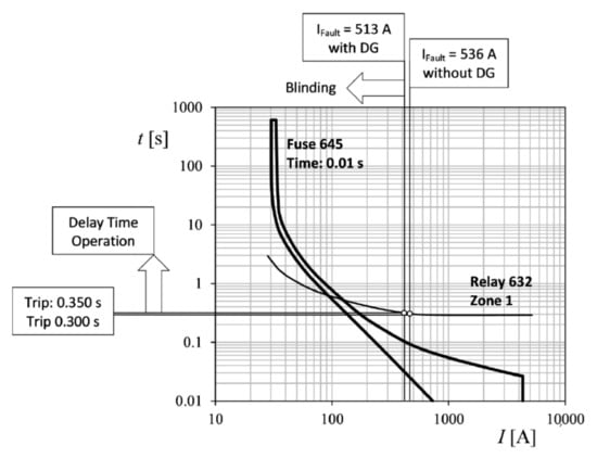 A three-phase short-circuit at bus 645 was simulated; the characteristic curves being plotted in Figure 4. In the graph, it shows that in the case of a fault between the substation and the DG, the presence of the latter represented a decrease in the value of the short-circuit current detected by the relay (R632 in Figure 3), from 536 A to 513 A. Thus, a loss in relay sensitivity (binding), as relay R632 at the main feeder detected a lower value of the fault current, with the triggering time also being delayed from 0.3 s to 0.35 s. These results are also summarized in Figure 5, and Table 2 at the end of this paper.