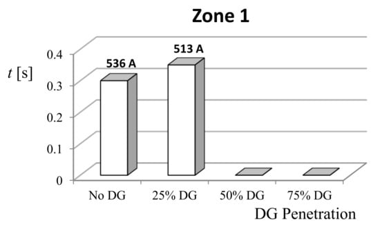 Additionally, the present protection procedures need to be revised, as the presence of DG sources might represent a quite serious effect on the current and triggering time reaction of the protection relays. According to the results and depending on the distance to the substation, the tripping time with DG was increased up to 167% (for 25% PV DG penetration) and 180% (for 50% and 75% PV DG penetration).