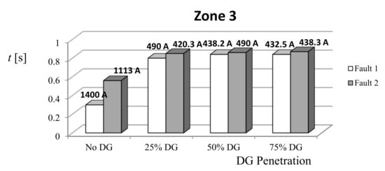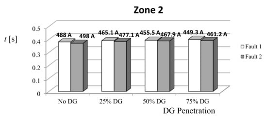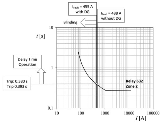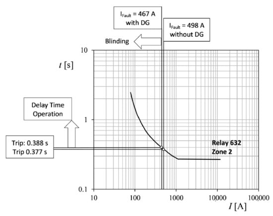 Protection Zone 2 current-time (I-t) performance of in case of a three-phase short-circuit at point F1, with 50% DG power (2 MW) at bus 633 (see Figure 6).