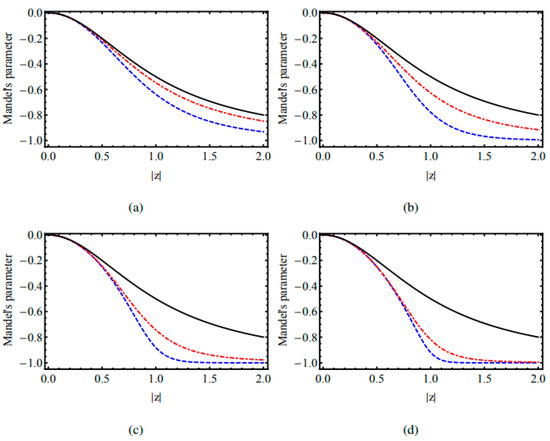 The parameter of the spin coherent states (SCSs) in the context of algebra, given by Equation (11), as function of for specific values of the deformed parameter and . (a) is for , (b) is for , (c) is for , and (d) is for Black (solid line) corresponds to which displays the case of SCSs, blue (dashed line) corresponds to , and red (dotted-dashed line) corresponds to . The values of the parameter are always negative in terms of , and , displaying a sub-Poissonian distribution of photons.