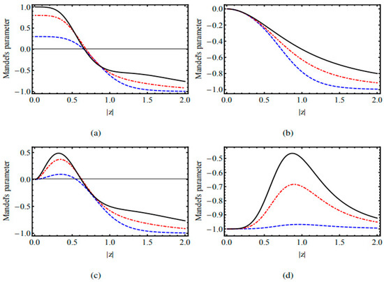 where is the mean photon number and is the photon number variance. This parameter depends on and . Let’s start with the non-deformed case that corresponds to the CSs defined by Equation (13). Figure 1, displays the graph of Mandel’s parameter in terms of for specific values of the parameters and . We can see from the first graph that for various values of the physical parameters. Interestingly, the parameter decreases with and approaches the value −1 as becomes significantly large. This shows that the DSCSs are always sub-Poissonian and they are closest to classical states (photon states with Poissonian distribution) in the case of with small values of .