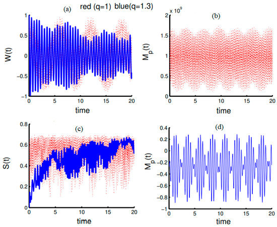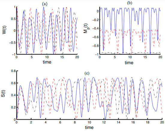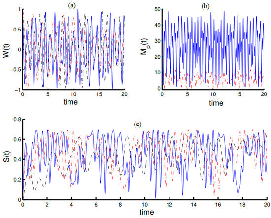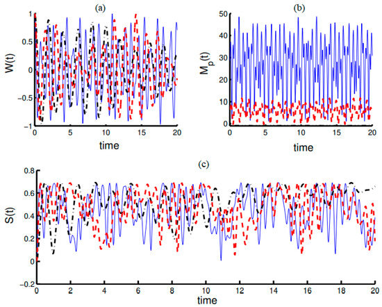 The dynamics of the different quantum quantifiers for specific values of the deformed parameter with , , and . (a) is for the atomic inversion, (b) and Figure 5d are for the Mandel’s parameter and (c) is for the von Neumann entropy. Blue (solid) line corresponds to , black (dotted-dashed) line corresponds to and red (dashed) line corresponds to .