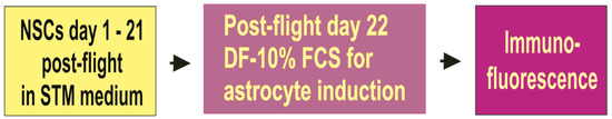 After 39.3 days in space and three weeks post-flight in NSCs culture medium, we cultured NSCs and their progenies derived from those flown to space in DF-10% FCS to direct their specification to the astrocyte phenotype (Figure 2).
