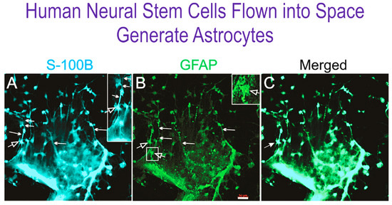 Glia, also called glial cells or neuroglia, are non-neuronal cells (astrocytes and oligodendrocytes) in the brain and spinal cord that maintain CNS homeostasis, form and maintain myelin, and provide support and protection for neurons. In the present study, we obtained astrocytes derived from NSCs flown into space. These astrocytes were generated in 1G upon return of the SPC-flown NSCs. This study is important because in the CNS, there are five times more astroglial cells (astrocytes) than neurons. In the past, the concept of neuroglia was introduced by Rudolf Virchow neuro-glia (nerve-cement) [18,19], when astrocytes were considered solely a physical support material for neurons. Currently, it is well known that astrocytes have a multitude of essential functions in the healthy CNS, including primary roles in synaptic transmission and information processing by neural circuit function [20]. Moreover, their secreted molecules such as gliotransmitters, neuromodulators, and trophic factors help maintain adult neurogenesis in the normal brain, while an imbalance of such molecules may be deleterious and contribute to CNS pathologies [21]. Astrocytes respond to all forms of CNS insults through reactive astrogliosis, which is a pathological hallmark of CNS structural lesions [11]. This means that instead of dying after injury or disease, astrocytes survive and undergo fundamental changes, as they display different degrees of astrogliosis proportional to the extent of injury [22] by proliferating and forming a “gliotic scar” to fill spaces left when neurons and glia die. Unfortunately, often the gliotic scar is the main obstacle for regeneration of the CNS tissue lost to injury or disease.