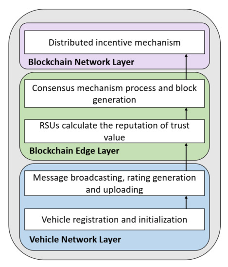 In this section, we explain the design architecture of blockchain-based VECNets, a secure and decentralized framework in vehicular networks, as shown in Figure 1. This architecture use consortium blockchain with preselected RSUs, and they are legitimate to execute the process of consensus while providing a decentralized reputation-based incentive mechanism to ensure trusted transaction processing. Here, we define the entities used in this paper, describe the design architecture in each layer, and give each step’s detailed procedures in the proposed system.