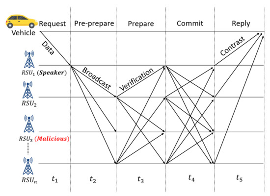 - Blockchain Edge Node Layer: This layer performs the critical process of calculating message credibility and the consensus mechanism. Here, RSUs are chosen to verify the data from the vehicle network layer. The sending vehicle periodically transmits the information message while the receiving vehicle uploads the evaluation result of the information message’s trust value. Then, RSU is authorized to store the data to the blockchain network layer by performing the consensus mechanism. RSUs, as the blockchain edge nodes, contain LSSC and RPSC smart contracts. LSSC is responsible for collecting data uploaded by vehicles and receiving data shared by other RSUs in distributed frameworks. RPSC stores the data into a blockchain network layer using the PBFT consensus mechanism. The data collected by RPSC contains the result of the calculation trust value rating based on majority rule to become the candidate block in the consensus process.