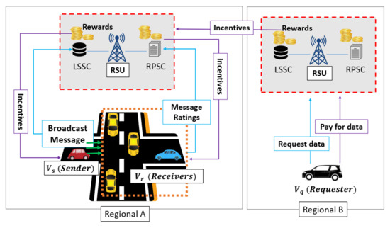 After the consensus mechanism generates the new block, that block is automatically distributed to all local storage of RSU. The blockchain network provides an incentive mechanism based on the contribution of participants. The rewards are obtained by vehicles with a good rating that generate the correct messages and contribute to the trust value assessment. In Figure 4, we assume that is already known to provide a valid message about a particular event in the regional A with a specific time. , as the neighboring vehicle on the same region, assesses the credibility message of by uploading the rating to the RSU. Later, RSU stores the correct message to the blockchain network. and obtain rewards based on their contributions in providing and assessing the information in a trusted manner. On the other case, for example, , which is on the regional B, requests the specific data in regional A. chooses and downloads the message provided by based on the positive rating provided by . Then, transfers payment for specific data requested to the system. Therefore, as data provider obtains an income from the system. Therefore, the system enables vehicles to download and forward packets for others securely.