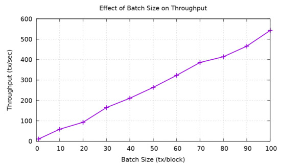 Data sharing flow begins with the vehicles sending or uploading all transactions to RSUs in the edge layer. RSUs use their transaction processors (i.e., LSSC and RPSC) to ensure the integrity of the transaction. Then, preselected RSUs conduct the consensus mechanism to generate the block (which consists of transactions) before storing it into the blockchain network. Here, the block size is equivalent to batch size in our simulation. The term batch size refers to the number of transactions that are in every block of the blockchain. We run multiple tests by changing batch size up to 100 tx/block to evaluate the effect of batch size on throughput. As can be inferred from Figure 5, at the total batch size of 100 tx/block, the throughput reaches 543 tx/s. The throughput is shown to increase linearly over different batch sizes.