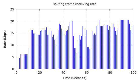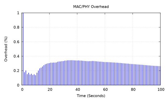 From the equation above, and denote, respectively, the physical and data link layer traffic that represents the physical/user network layer in our proposed model architecture. On the other hand, the value of MAC/PHY overhead is in the range [0, 1] and is given by Equation (3). Here, the lower value indicates better performance of the system, and vice versa. Figure 8 shows the result of MAC/PHY overhead in 100 s simulation time. As shown in the figure, we can see that the overhead is relatively stable after 20 s of simulation time within the range of 0.2 to 0.3, and it even slightly decreases over time. Based on these results, our proposed protocol is relatively efficient due to does not incur high overhead.