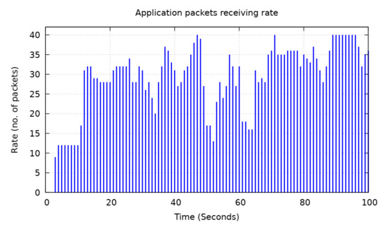 The data and application rate parameter refers to the total number of successfully sent vehicle data in a unit of time (in bit per second for data rate, and in the packet for application rate), which shows the transmission rate effectiveness in vehicular networks. It also represents an average traffic flow rate where the higher value indicates a better system performance [36]. All vehicles attempt to continuously route 64 byte application packets at a rate of 2.048 Kbps in our scenario. Figure 6 shows the application data receiving rate with the overall average throughput remaining at 140 Kbps, whereas Figure 7 shows the receiving rate at an average rate of 25 packets per second. We consider the application packet as well as the blockchain packet to evaluate the performance of application traffic in our system.